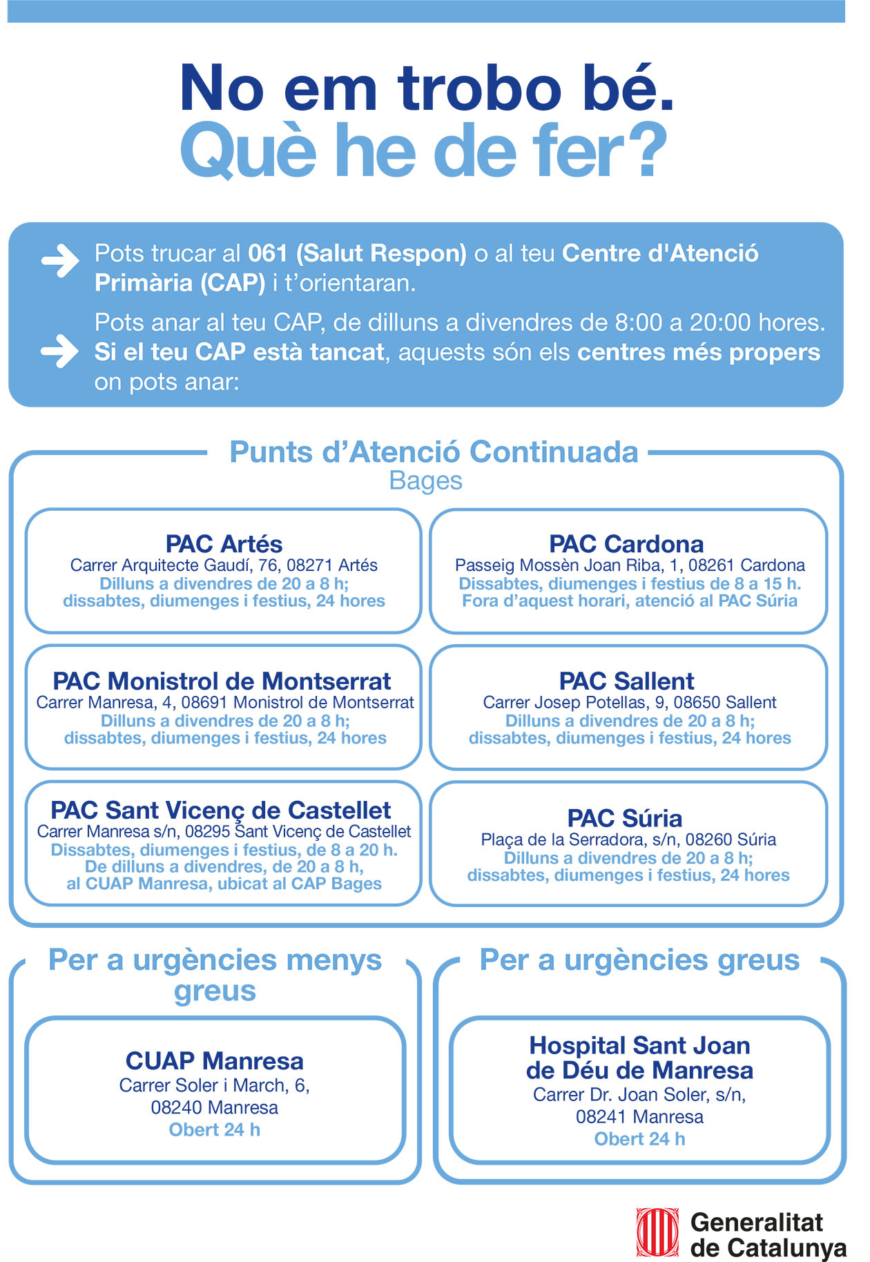 L'Ajuntament de Sant Vicenç de Castellet difon la campanya del Departament de Salut al territori No em trobo bé. Què he de fer? que té com a objectiu facilitar una millor orientació davant una necessitat urgent de salut i promoure un ús adequat dels recursos assistencials. Sota el lema No em trobo bé. Què he de fer? la iniciativa ofereix informació clara i entenedora sobre on adreçar-se en funció de la gravetat del problema de salut reforçant el paper del 061 Salut Respon i de l'atenció primària com a porta d'entrada al sistema sanitari.