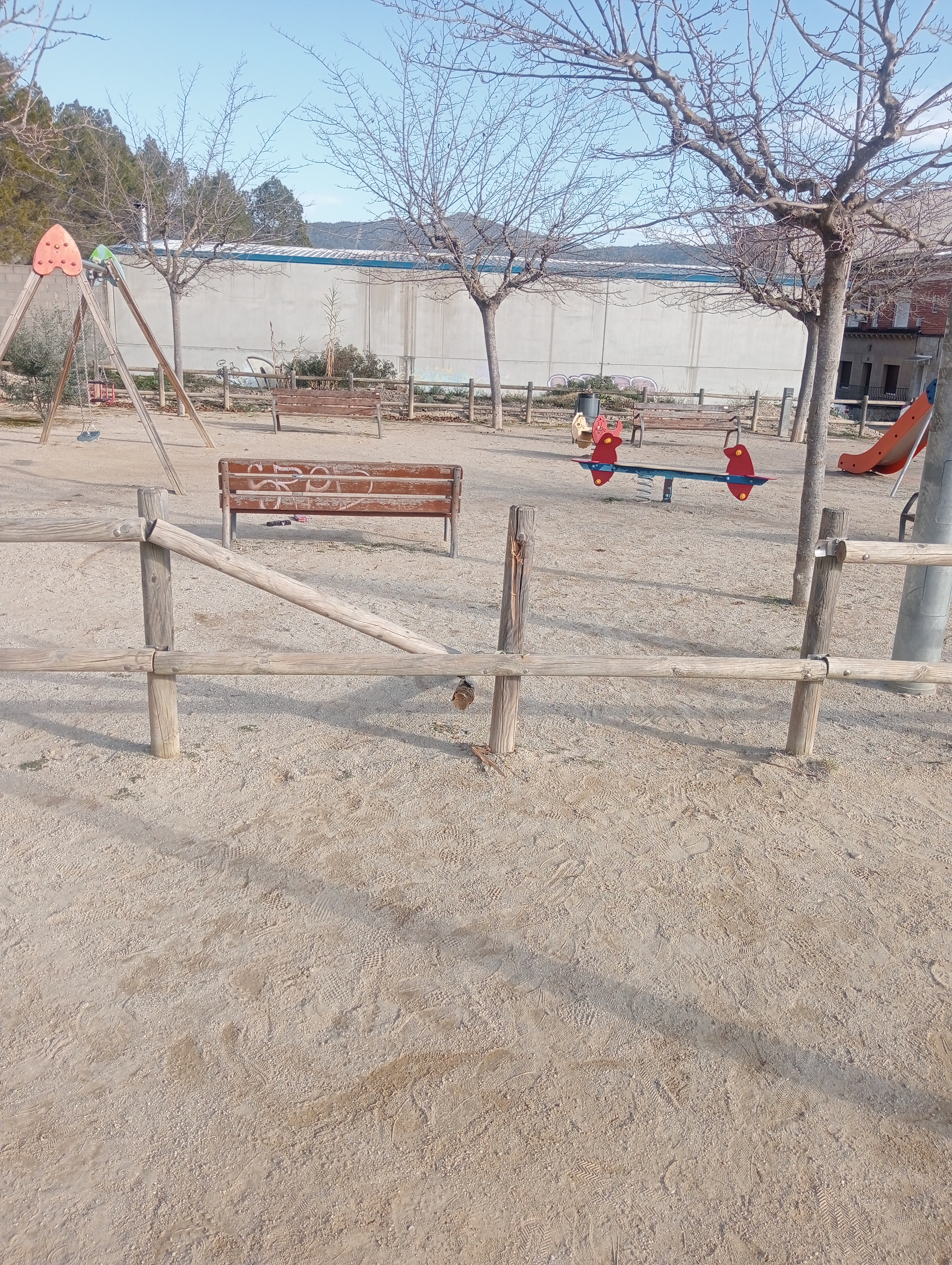El parc està malmès, falta una corda y el tros trencat talla molt. Si es pasa la mà per a sota de la corsa trencada surten unas punxes metálicas.Es molt perillós pels infants més petits que els hi ve a la seva alçada. GraciasVP202300006210/04/2023