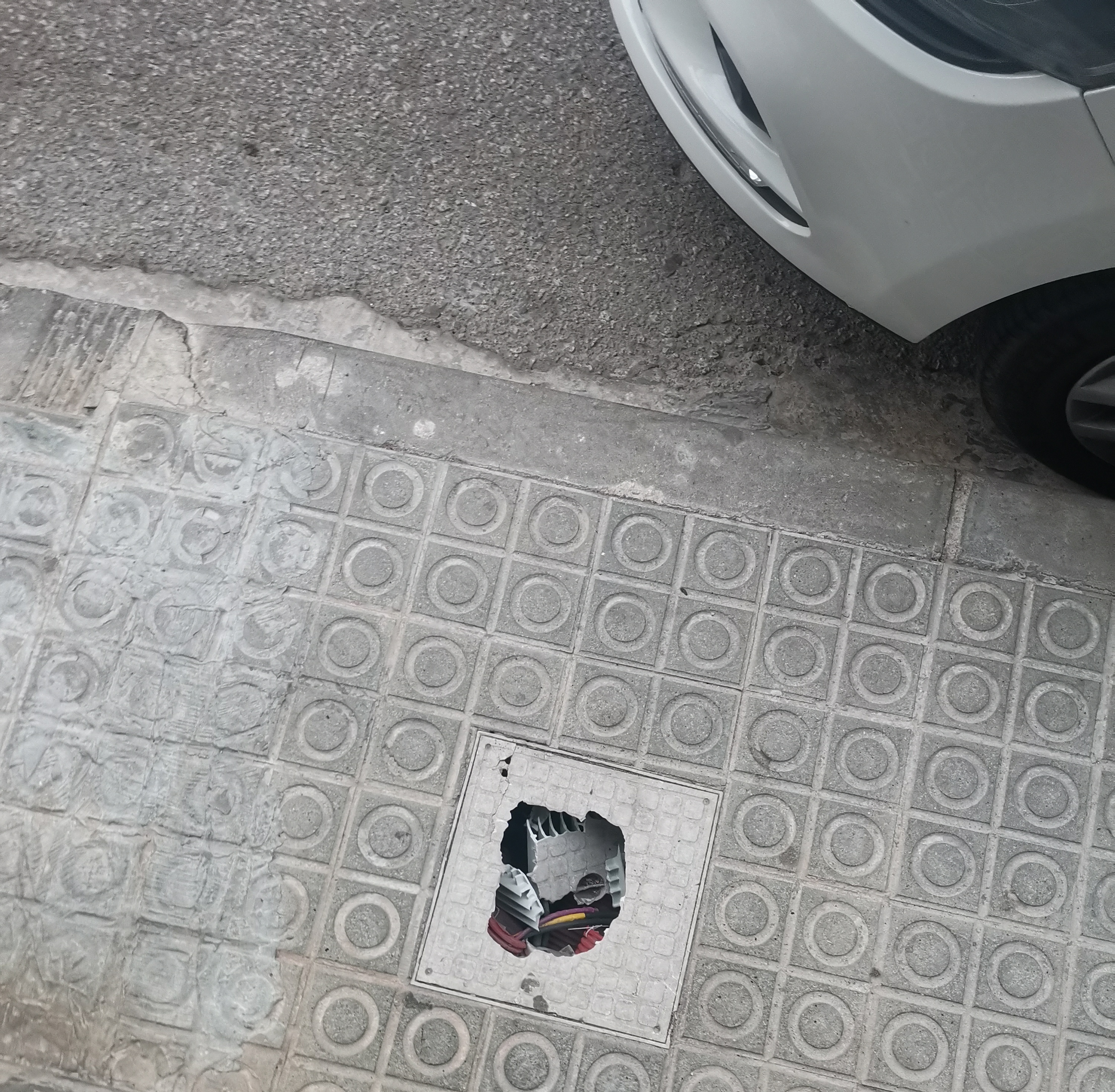 Just a la sortida de casa la tapa de plastic que esta a la vorera tapant uns cables esta trencada. Es zon ade pas de nens que van a l'escola.VP202300007119/04/2023
